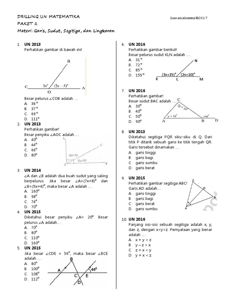 Jadi, besar sudut mln = 20°. Jadi, panjang kl = 13 cm dan panjang mk = 10 cm. Jumlah sudut pada bangun segi empat di kurangi dengan sudut yang telah diketahui. Simulasi unbk matematika smp 2019 (*soal dan pembahasan paket a) p ersiapan untuk melaksanakan ujian nasional berbasis komputer atau yang lebih dikenal istilahnya dengan unbk sudah dioptimalkan, salah satunya adalah dengan melakukan simulasi unbk. Soal juga dapat diunduh melalui tautan berikut: